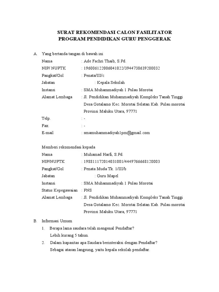 Contoh Surat Rekomendasi Kepala Sekolah Untuk Guru Calon Kepala Sekolah - Surat Rekomendasi Misdar Pdf